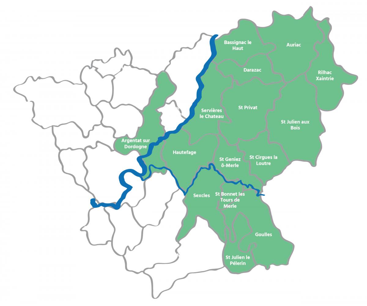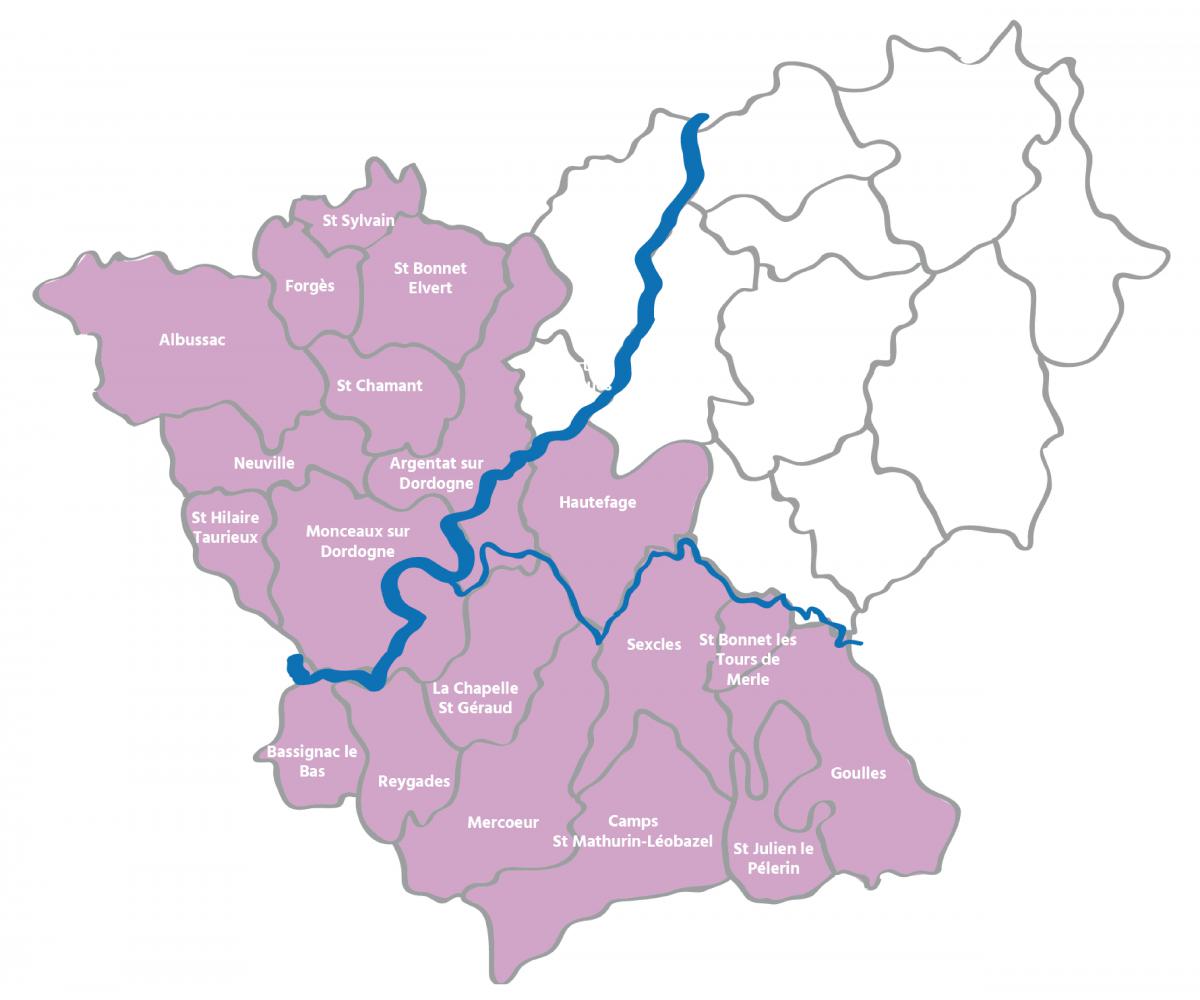 Syndicat Mixte Dordogne Moyenne Cère Aval "SMDCA" : (en aval des barrages) avec 4 autres communautés de communes du Cantal et du Lot