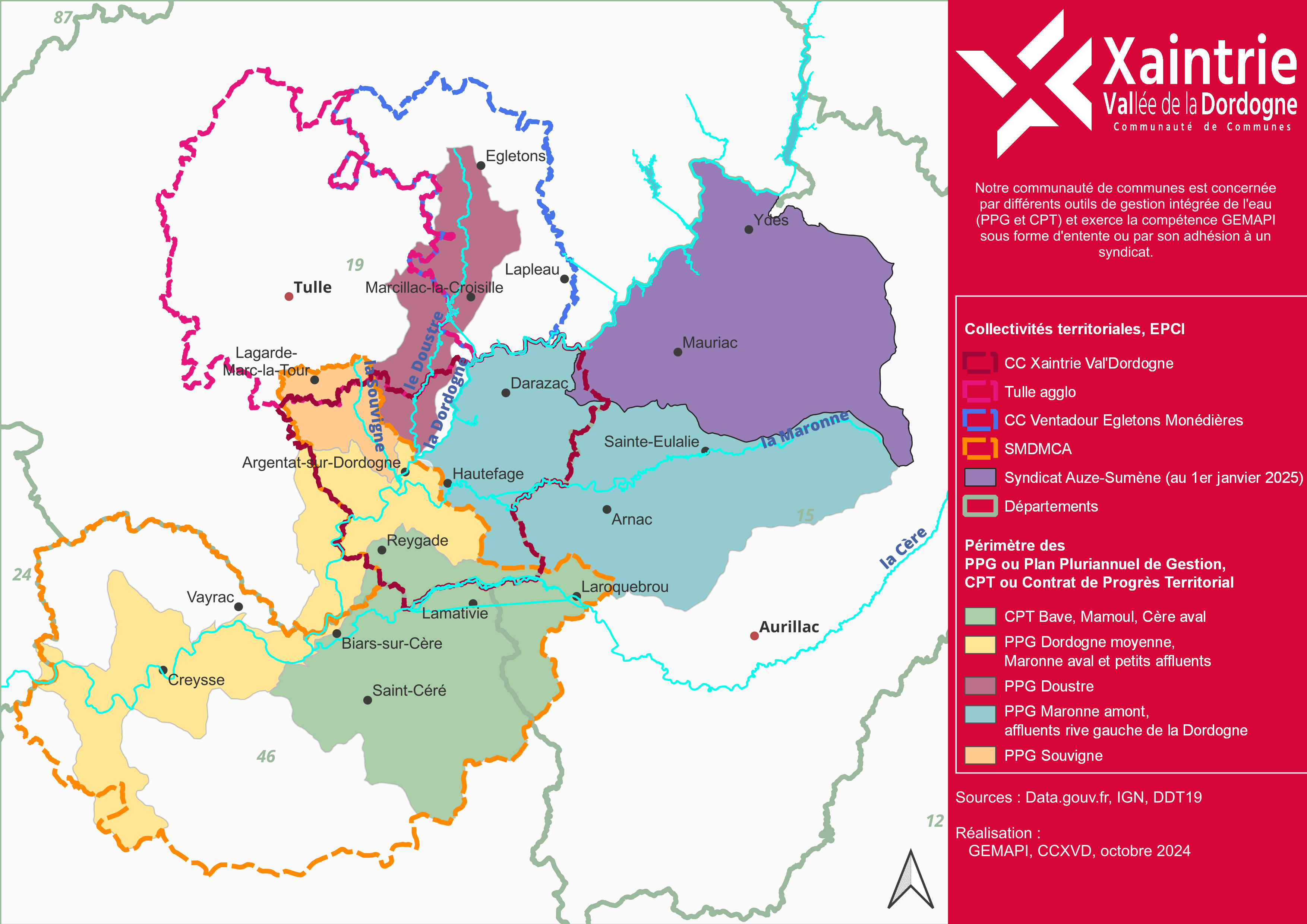 La Communauté de Communes Xaintrie Val'Dordogne exerce cette compétence sur l'ensemble de ses cours d'eaux présents sur ses trente communes.
