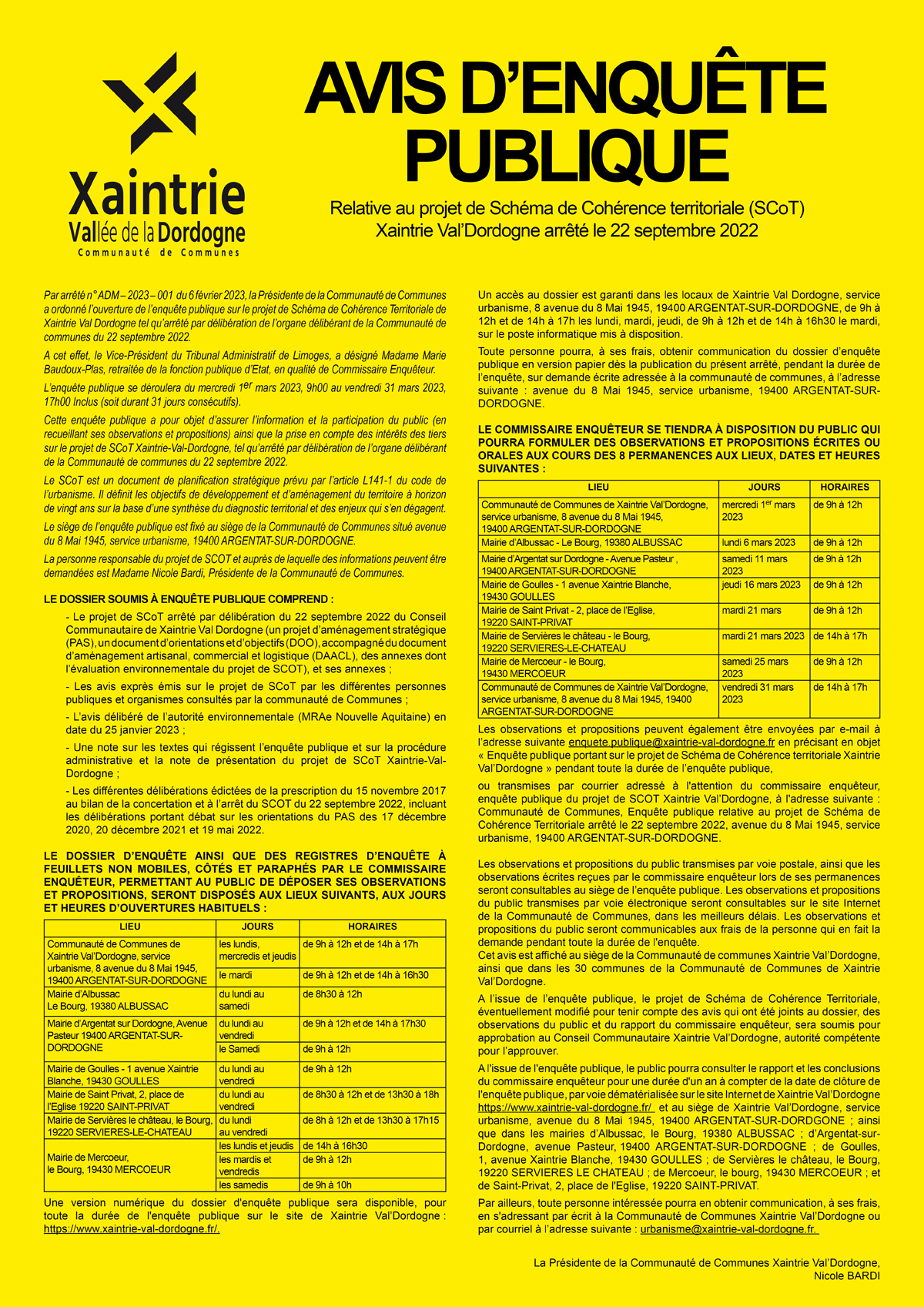 Vous remerciant de l’intérêt porté à l’élaboration du SCoT Xaintrie Val Dordogne et restant à votre disposition,