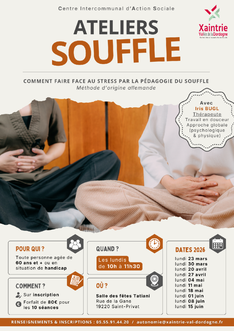Le Centre Intercommunal d’Action Sociale Xaintrie Val' Dordogne vous propose ses Ateliers Souffle : "Comment faire face au stress".