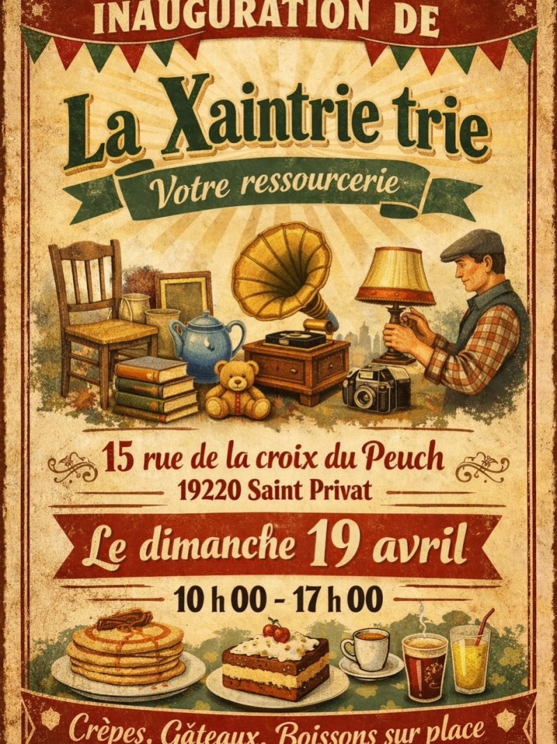 La ressourcerie la Xaintrie trie ouvre le dimanche 19 avril 2026 dans l’ancienne salle des fêtes de Saint-Privat, 15 rue de la Croix du Peuch.